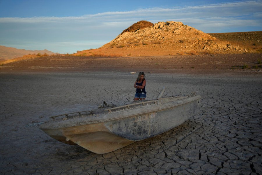 Misha McBride looks at a formerly sunken boat now on cracked earth hundreds of feet from what is now the shoreline on Lake Mead at the Lake Mead National Recreation Area, Monday, May 9, 2022, near Boulder City, Nev. (AP Photo/John Locher)