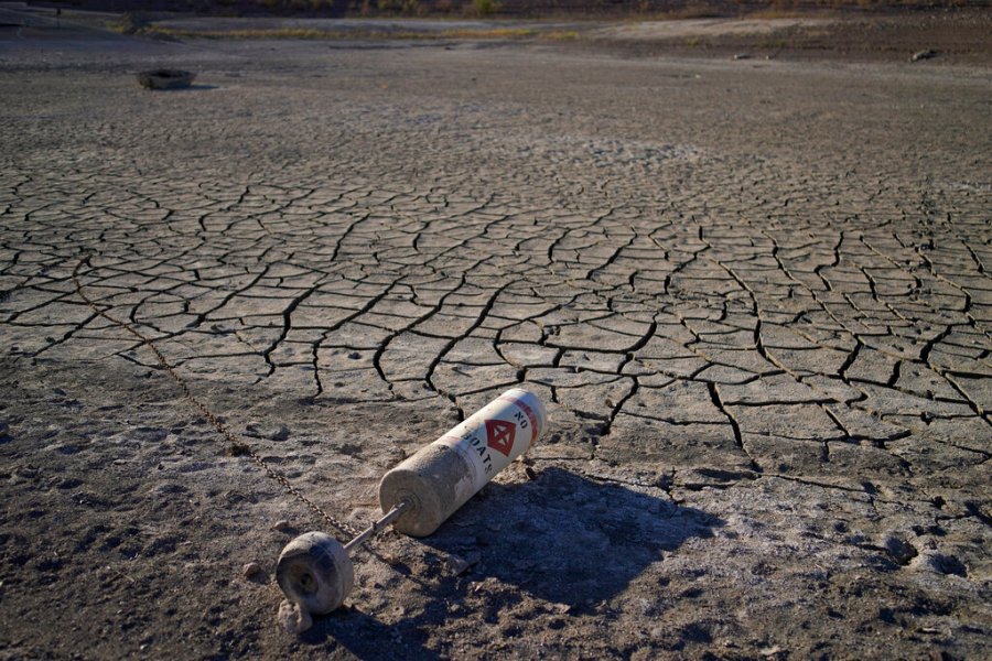 A formerly floating buoy lies on cracked earth hundreds of feet from what is now the shoreline on Lake Mead at the Lake Mead National Recreation Area, Monday, May 9, 2022, near Boulder City, Nev. Las Vegas is being flooded with lore about organized crime after a second set of human remains emerged within a week from the depths of the drought-stricken Colorado River reservoir just a 30-minute drive from the notoriously mob-founded Strip. (AP Photo/John Locher)