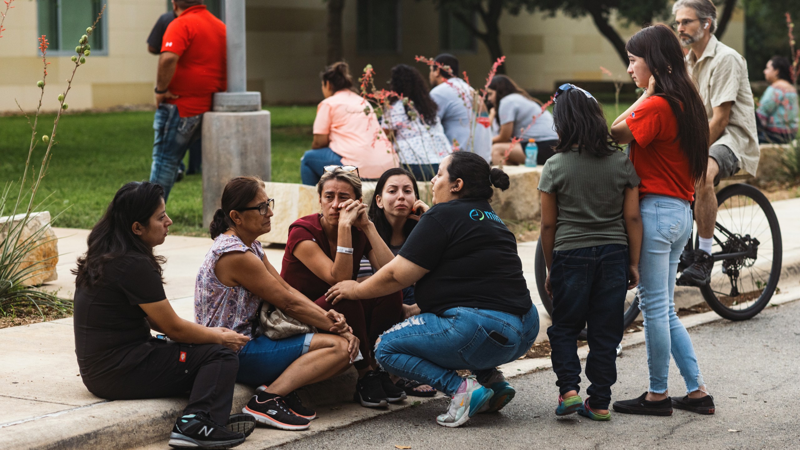 UVALDE, TX – MAY 24: People grieve outside the SSGT Willie de Leon Civic Center, where the community has gathered in the wake of a mass shooting at Robb Elementary School on May 24, 2022 in Uvalde, Texas. According to reports, 19 students and 2 adults were killed before the gunman was fatally shot by law enforcement. (Photo by Jordan Vonderhaar/Getty Images)