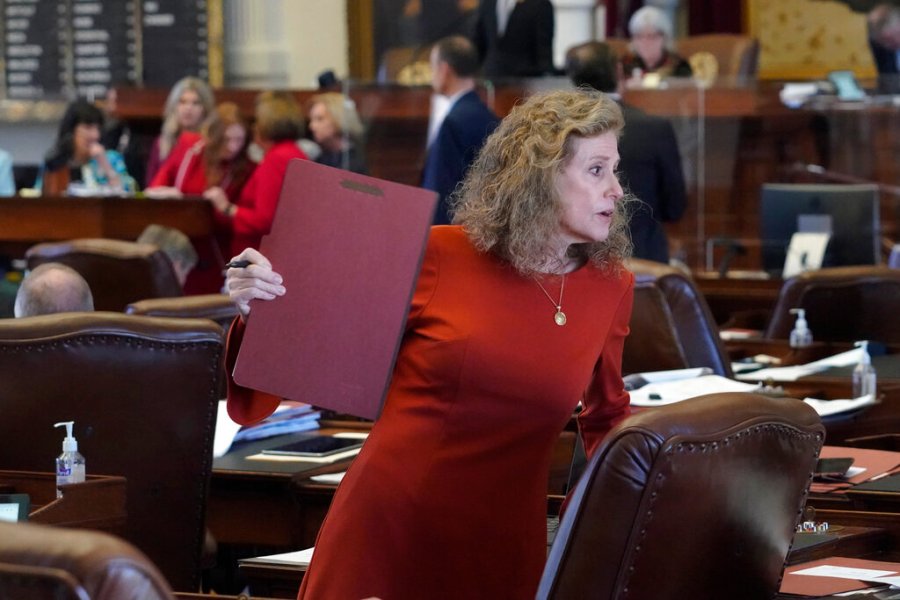 Texas State Rep. Donna Howard, D-Austin, talks with fellow lawmakers in the House Chamber, Wednesday, May 5, 2021, in Austin, Texas. Howard opposes a bill introduced in Texas that would ban abortions as early as six weeks and allow private citizens to enforce it through civil lawsuits, under a measure given preliminary approval by the Republican-dominated state House on Wednesday. (AP Photo/Eric Gay)