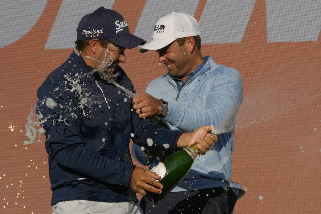 Hennie Du Plessis, left and Charles Schwartzel, teammates on the winning Stinger team, celebrate with champagne on the winners podium during the presentation ceremony at the inaugural LIV Golf Invitational at the Centurion Club in St Albans, England, Saturday, June 11, 2022. Schwartzel won the individual title and his team won the team title. (AP Photo/Alastair Grant)