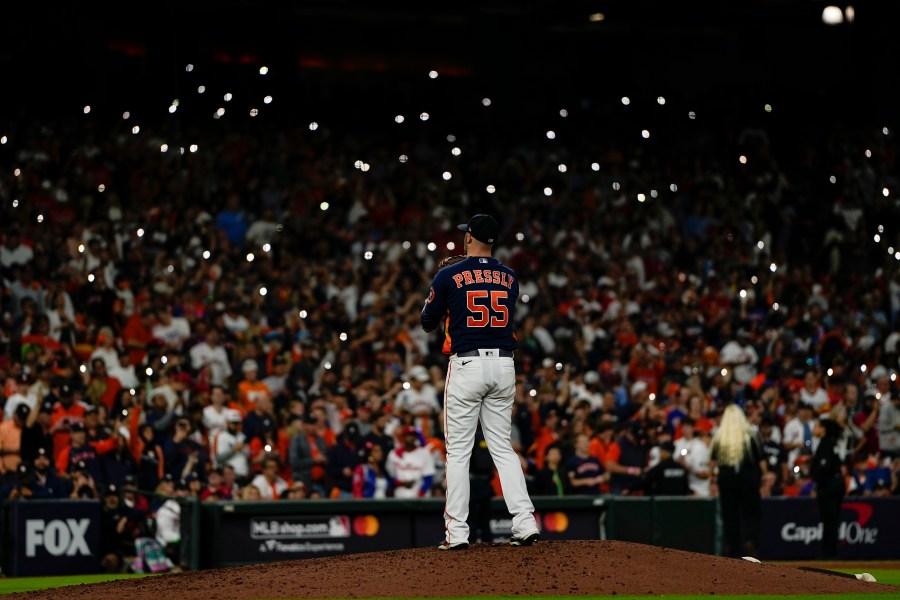 Ryan Pressly finished a six-hitter for a bullpen that lowered its postseason ERA to 0.89, giving up a run when first baseman Yuli Gurriel allowed Brandon Marsh’s grounder to skip past him and down the right-field line for an error.