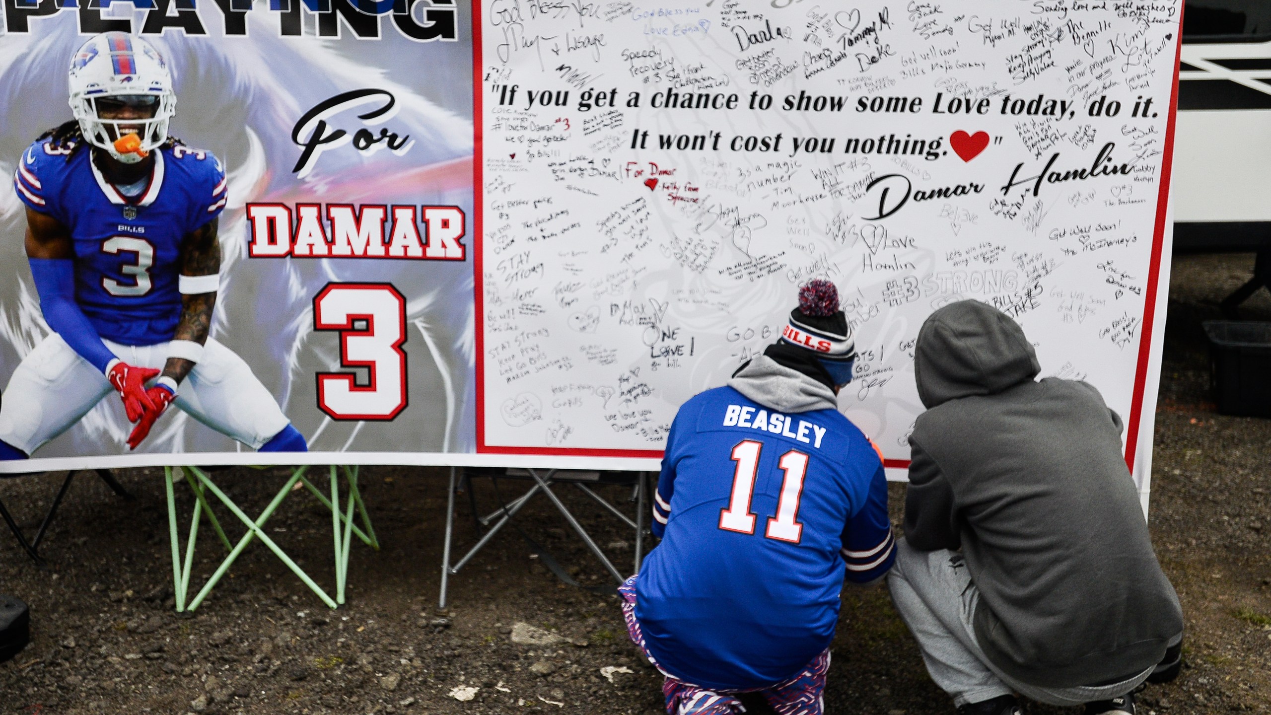 Fans filled the front of the sign with well-wishes some three hours before kickoff, offering messages such as “Stay Strong” and “Love.” Some wore No. 3 jerseys, which is Hamlin’s number.