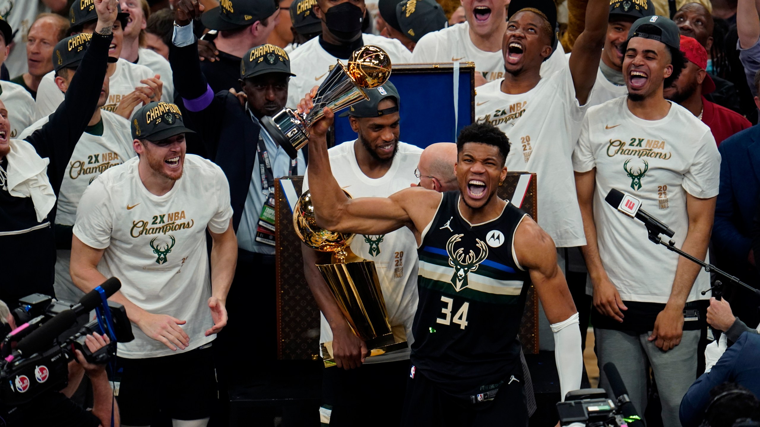 MILWAUKEE (AP) — Giannis Antetokounmpo had the Larry O’Brien Trophy in one arm, the NBA Finals MVP trophy in the other and there was a cigar on the table in front of him.