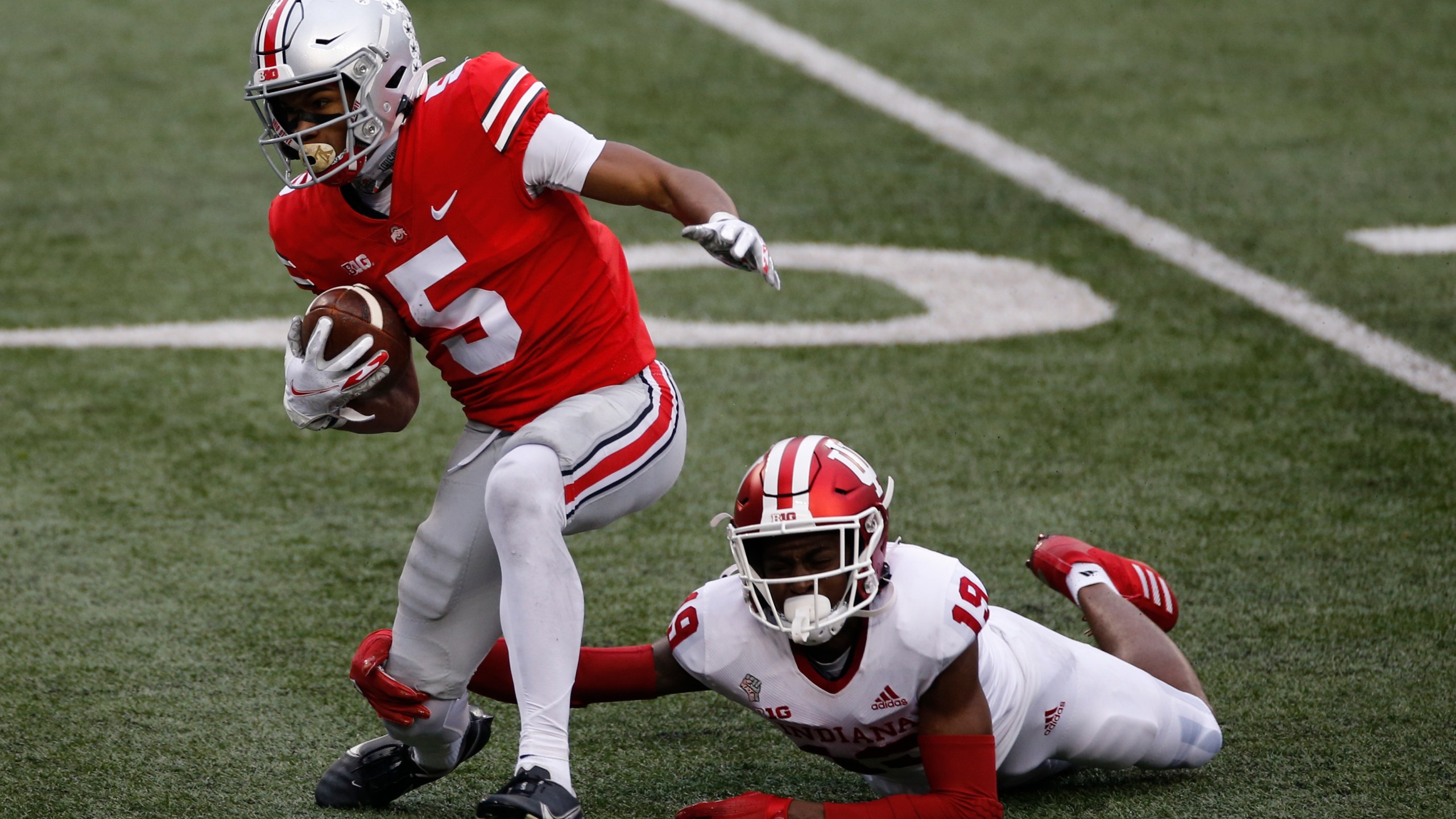 Ohio State receiver Garrett Wilson, left, tries to get away from Indiana defensive back Josh Sanguinetti during the second half of an NCAA college football game Saturday, Nov. 21, 2020, in Columbus, Ohio. Ohio State beat Indiana 42-35. (AP Photo/Jay LaPrete)