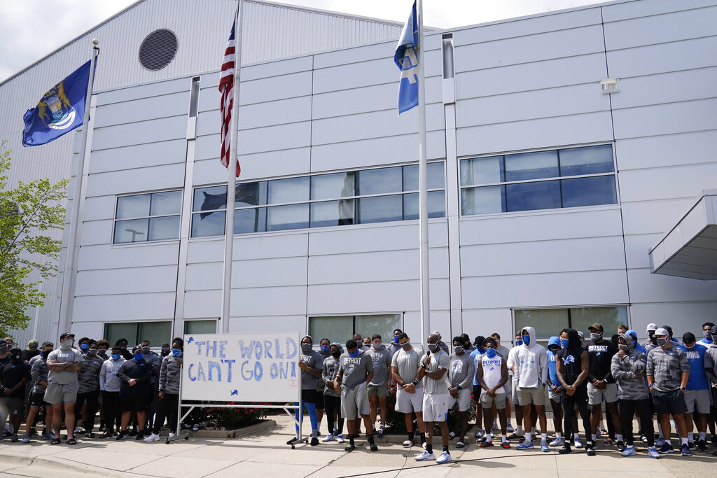 Lions players and Patricia later filed out of the team’s practice facility, pushing a dry-erase board on wheels along the sidewalk to address the media. The words: “The world can’t go on,” was written in blue on one side of the dry-erase board and “We won’t be silent!! One pride,” was in black on the other side of the white board.