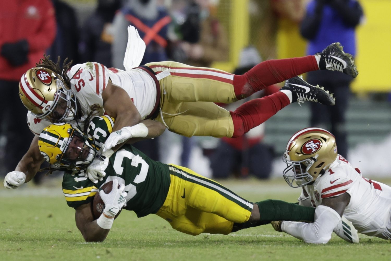 San Francisco 49ers’ Fred Warner stops Green Bay Packers’ Aaron Jones during the first half of an NFC divisional playoff NFL football game Saturday, Jan. 22, 2022, in Green Bay, Wis. (AP Photo/Matt Ludtke)