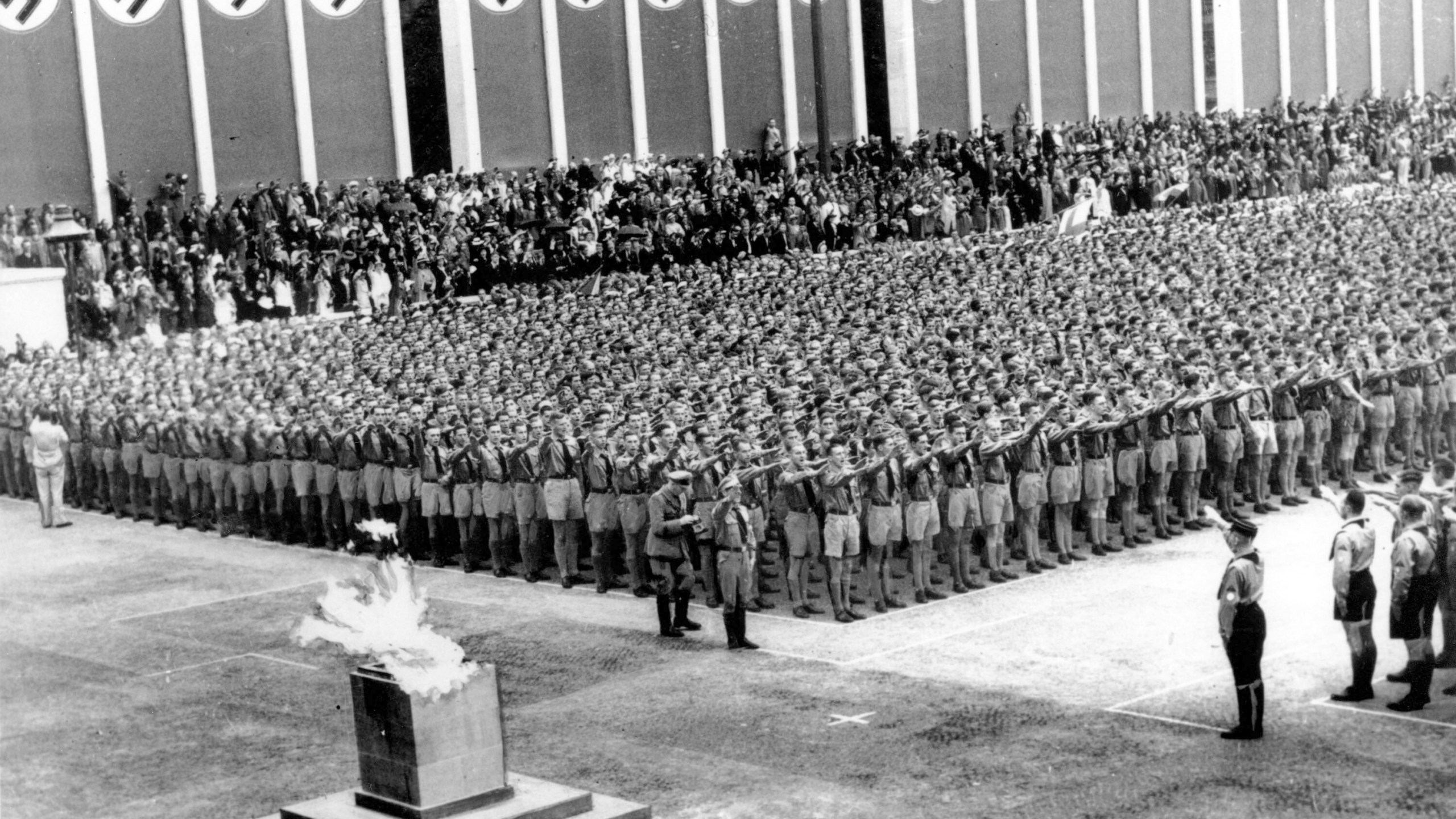 FILE – In this Aug. 1, 1936, file photo, German Nazi soldiers line up at attention during the opening ceremonies of the XI Summer Olympic Games at the Lustgarten in Berlin, Germany. The lighted Olympic torch is in the foreground. The torch relay was not always a fixture of the modern Olympics, which began in 1896. The relay tradition began with Adolph Hitler’s 1936 Olympics in Berlin, the Games of the XI Olympiad, and was the brainchild of Dr. Carl Diem who was the head of the organizing committee. (AP Photo/File)