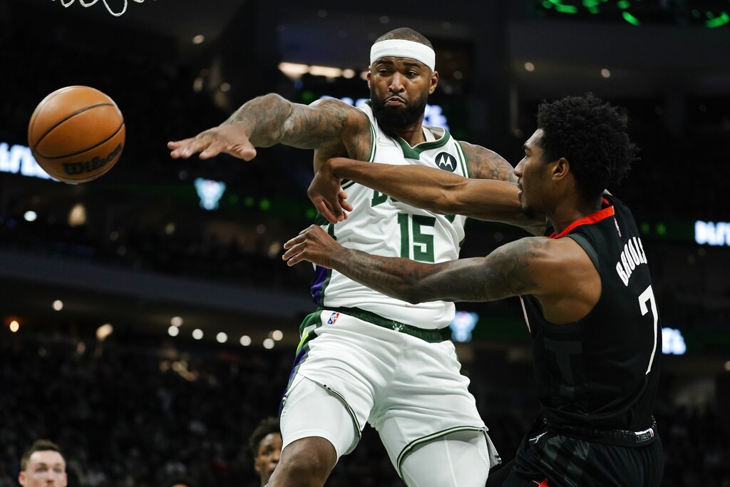Houston Rockets’ Armoni Brooks passes around Milwaukee Bucks’ DeMarcus Cousins during the first half of an NBA basketball game Wednesday, Dec. 22, 2021, in Milwaukee. (AP Photo/Morry Gash)
