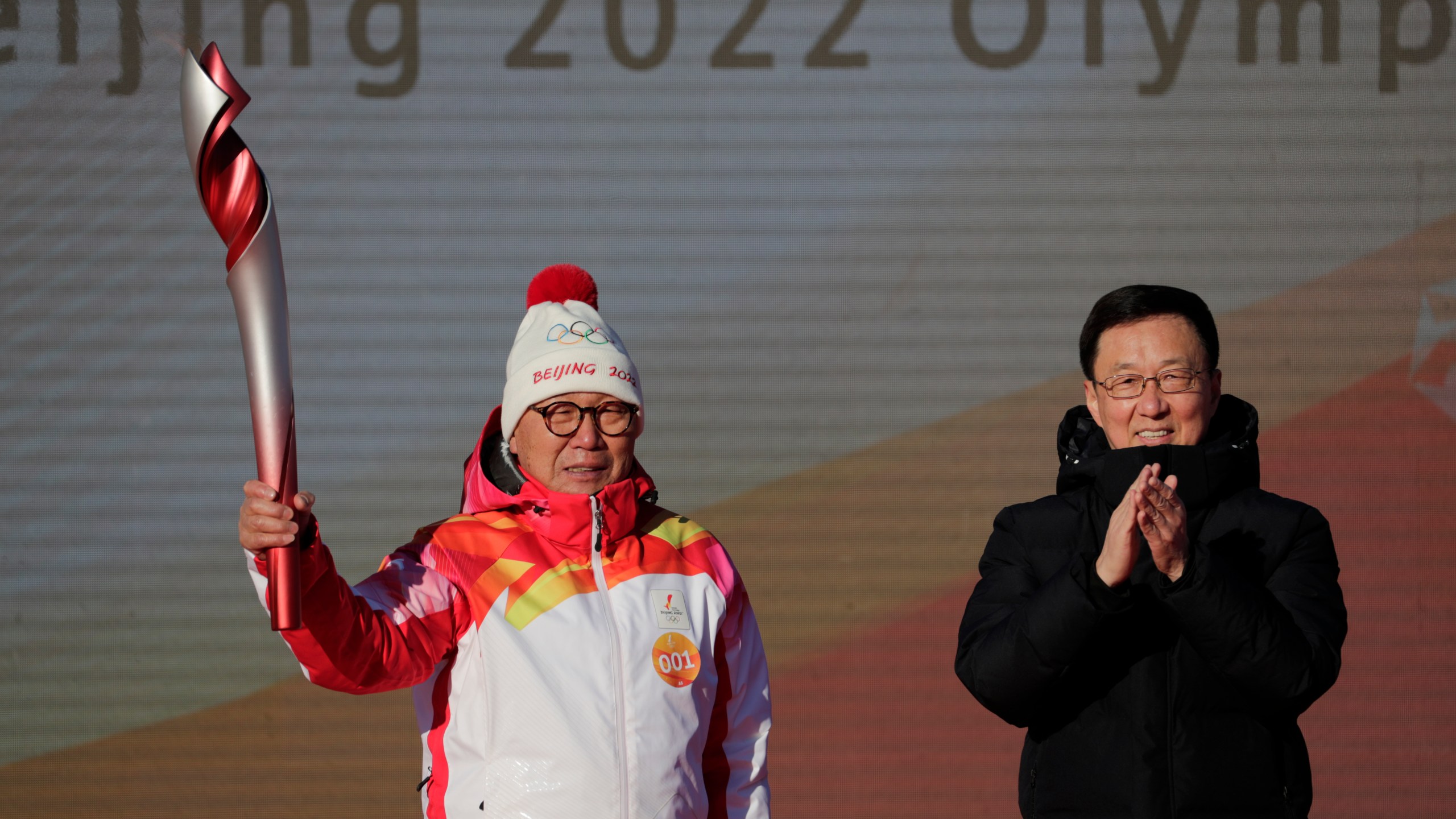 First Torch bearer Luo Zhihuan holds up the torch after receiving it from Chinese Vice Premier Han Zheng before the start of the torch relay for the 2022 Winter Olympics at the Olympic Forest Park in Beijing on Wednesday, Feb. 2, 2022. (AP Photo/Sam McNeil)