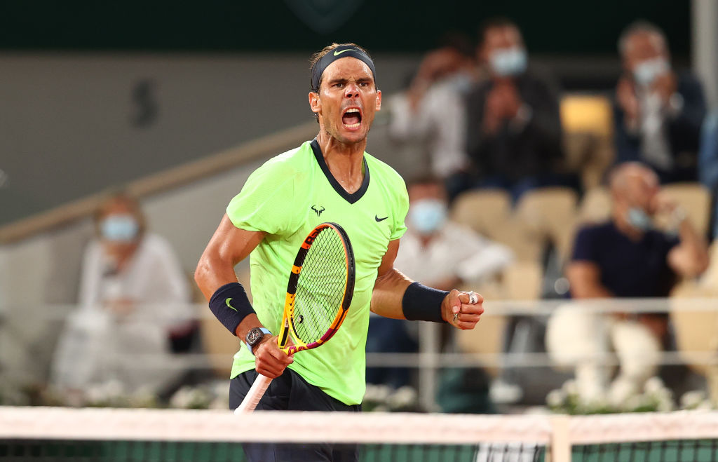 PARIS, FRANCE – JUNE 11: Rafael Nadal of Spain celebrates during his Men’s Singles Semi Final match against Novak Djokovic of Serbia on day Thirteen of the 2021 French Open at Roland Garros on June 11, 2021 in Paris, France. (Photo by Julian Finney/Getty Images)