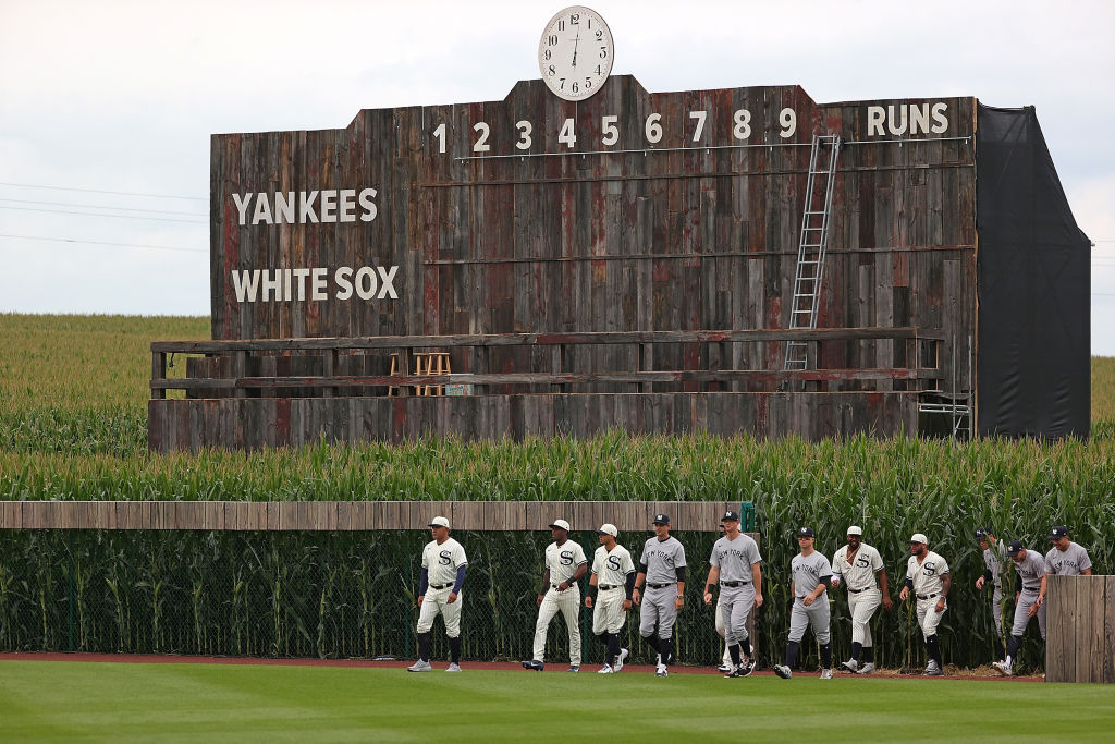 DYERSVILLE, IOWA – AUGUST 12: Members of the Chicago White Sox and the New York Yankees take the field prior to a game at the Field of Dreams on August 12, 2021 in Dyersville, Iowa. (Photo by Stacy Revere/Getty Images)