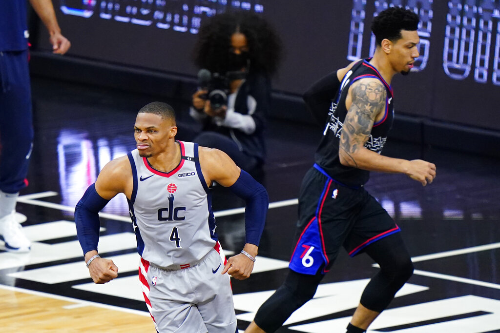 Washington Wizards’ Russell Westbrook, left, reacts past Philadelphia 76ers’ Danny Green after a dunk during the first half of Game 2 in a first-round NBA basketball playoff series, Wednesday, May 26, 2021, in Philadelphia. (AP Photo/Matt Slocum)
