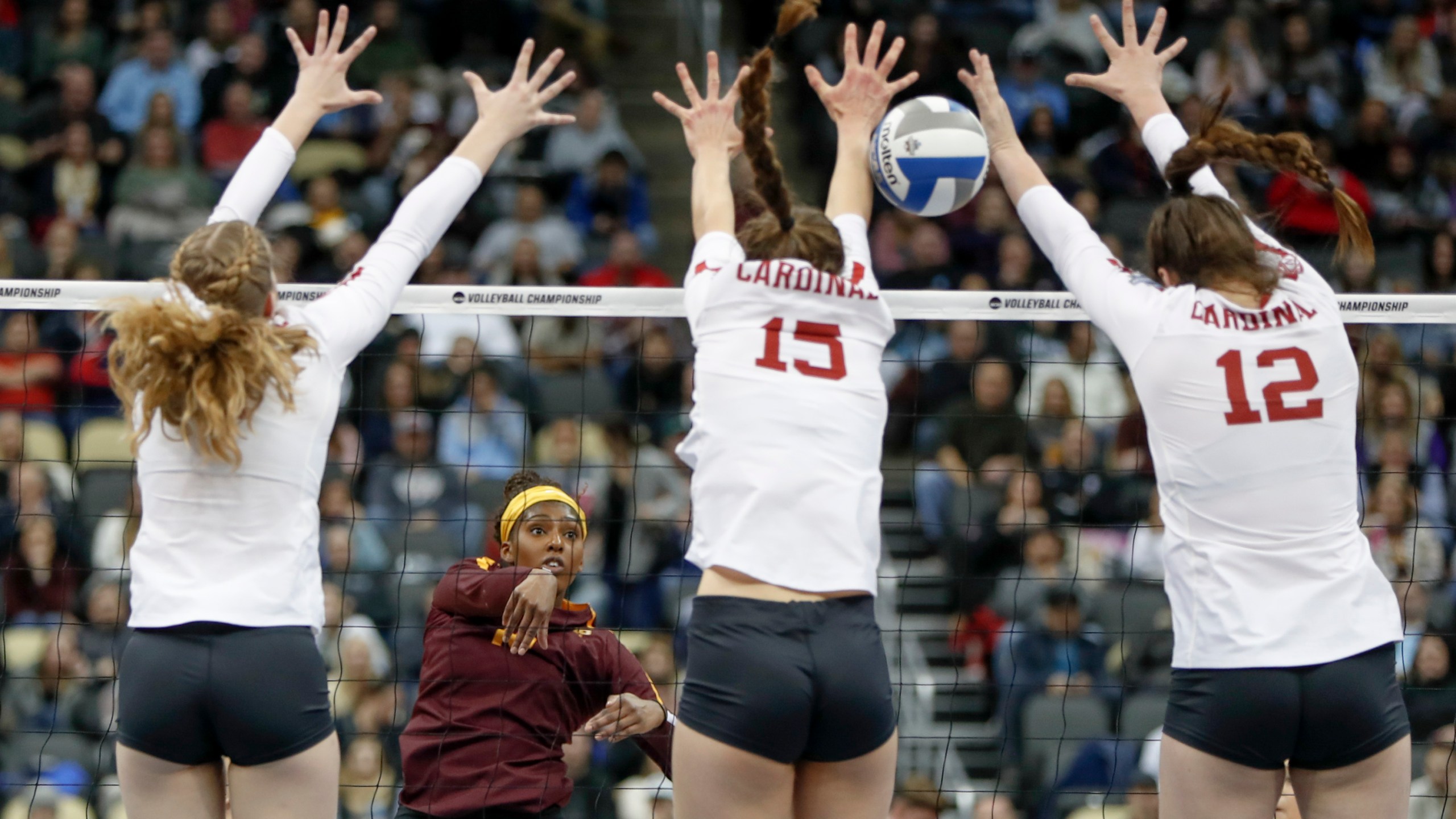 FILE – In this Dec. 19, 2019, file photo, Stanford’s Holly Campbell, left, Madeleine Gates (15) and Audriana Fitzmorris (12) go up to block a hit by Minnesota’s Alexis Hart during the semifinals of the NCAA Division I women’s volleyball championships in Pittsburgh. If all the athletes from Stanford had been their own country, they would have tied for 11th place in the medal standings at the 2016 Olympics. It’s an eye-opening statistic that has been made more jarring because of the recent decision by Stanford to remove nine Olympic sports from its varsity program. (AP Photo/Keith Srakocic, File)