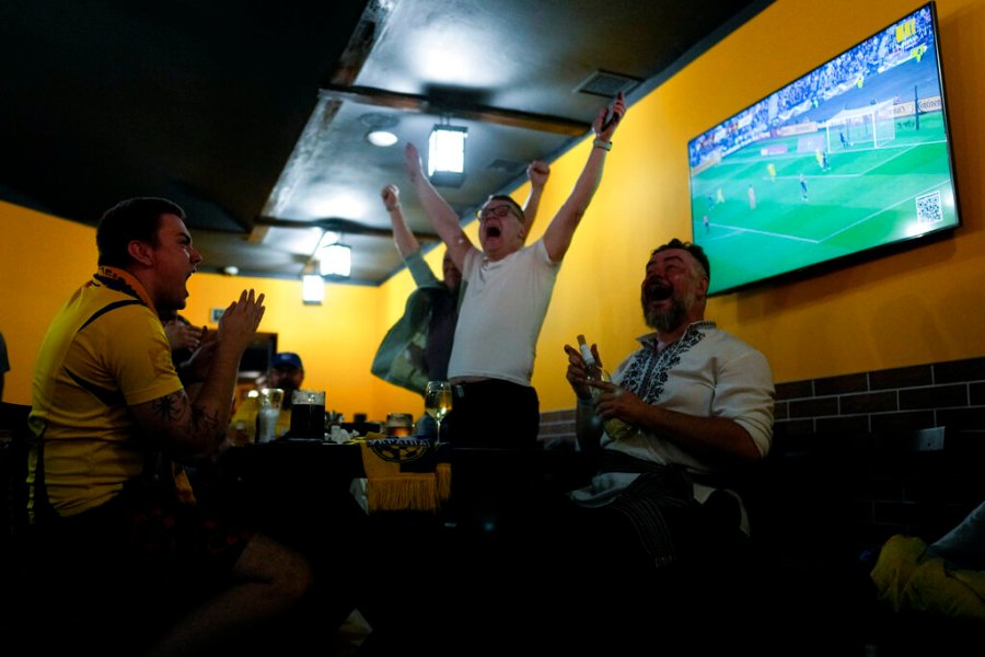 Oleksii Safin, 40, who works as a voice actor, stood with his right hand over his heart as he belted out the national anthem. He and other supporters erupted in celebration when Ukraine scored first. But the war raging in the east of the country wasn’t forgotten.
