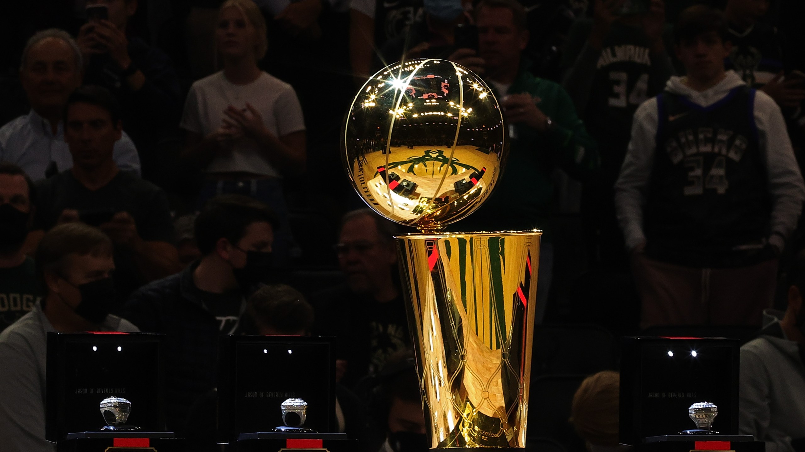 MILWAUKEE, WISCONSIN – OCTOBER 19: A detailed view of the Larry O’Brien Championship Trophy and the 2021 NBA Championship rings prior to a game between the Milwaukee Bucks and the Brooklyn Nets at Fiserv Forum on October 19, 2021 in Milwaukee, Wisconsin. (Photo by Stacy Revere/Getty Images)