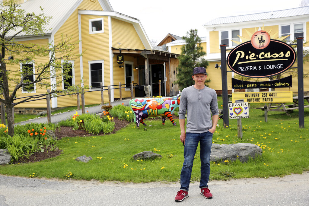 Eduardo Rovetto poses outside his restaurant Piecasso Pizzeria & Lounge in Stowe, Vt., on Saturday, May 8, 2021. Rovetto says he would like to hire between 15 and 20 workers, but he’s not getting enough interest.