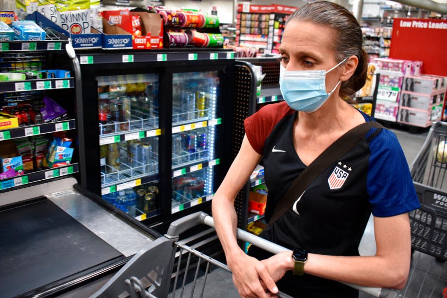 Crystal Dvorak shops at WinCo Foods, Saturday, May, 7, 2021, in Billings, Mont. Dvorak recently lost her job as an audiologist. The day Montana Gov. Greg Gianforte announced the $300 benefit would end June 27 was Dvorak’s second day of unemployment. (AP Photo/Matthew Brown)