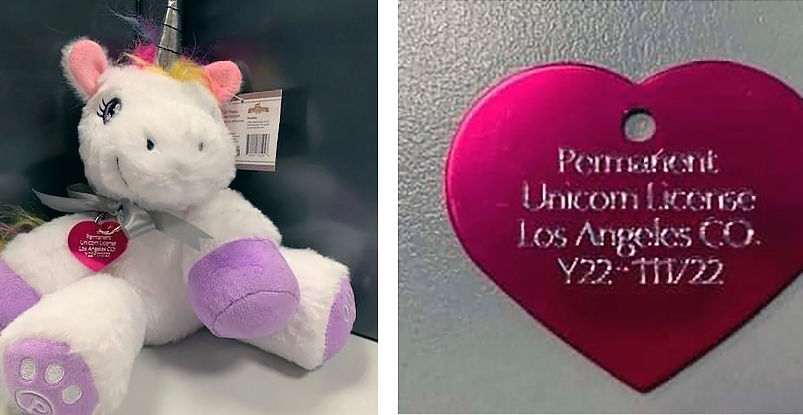 These images released by the Los Angeles County Animal Care and Control and posted via Instagram, shows a created a unicorn license tag, right, and a plush toy unicorn, after a young girl requested permission to have a unicorn in her backyard, if she could find one. Animal Care and Control Department officials said this week that they granted the unusual permit to Madeline, whose last name was redacted. (Los Angeles County Animal Care and Control via AP)