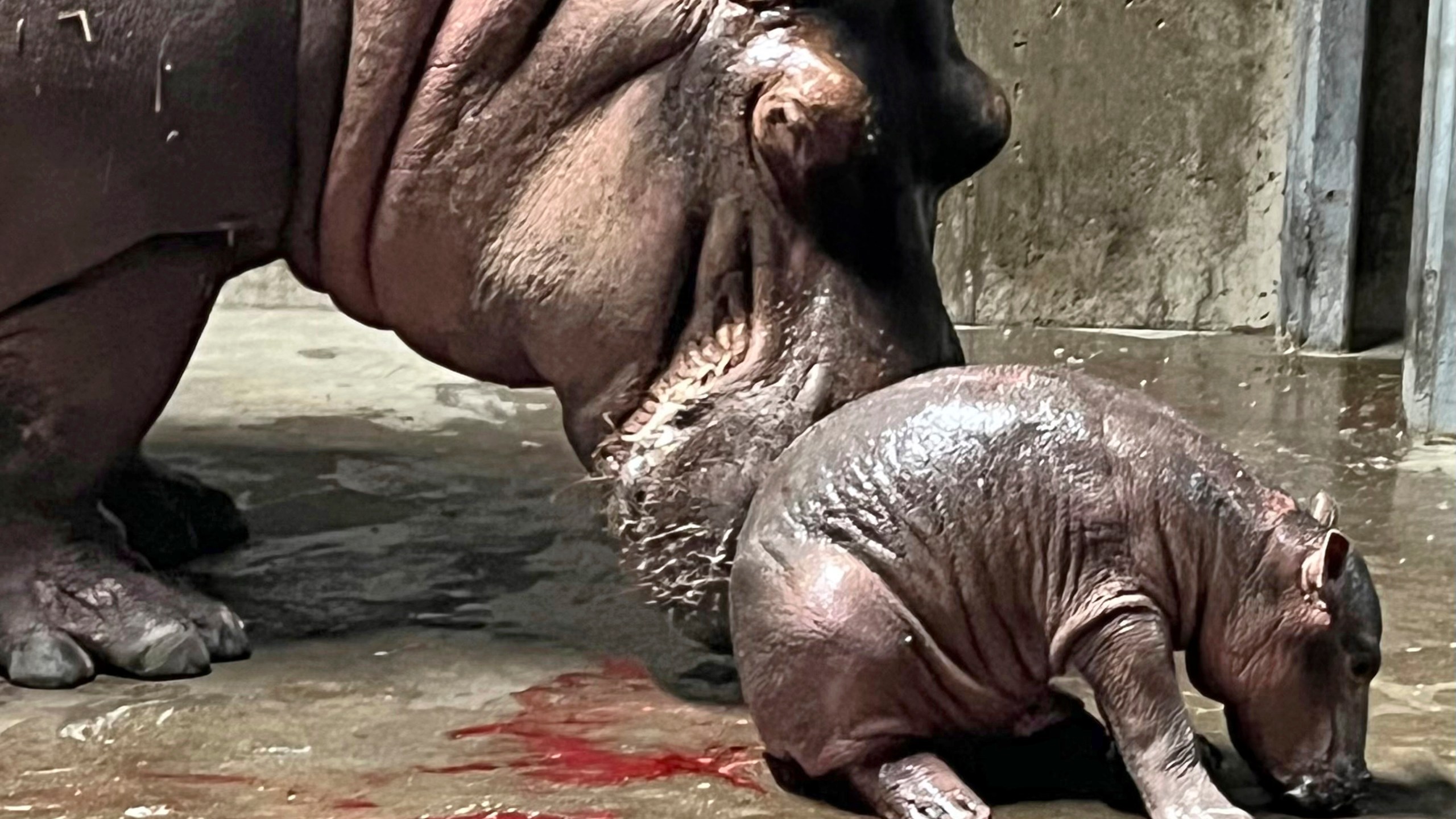 Bibi’s first baby, Fiona, only weighed 29 pounds (13 kilograms) when she was born six weeks premature and wasn’t able to stand on her own. Fiona now weighs 2,000 pounds (907 kilograms), the zoo said.