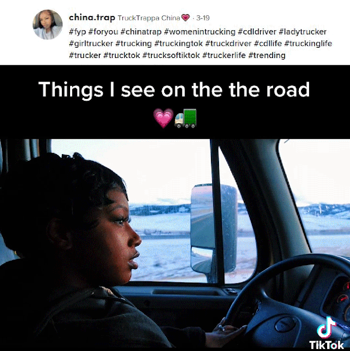 Savonn Barnes-Poags, or @china.trap on TikTok to her 151,000 followers, knows what that’s like. In her TikToks, she documents the long working hours that come with the job; the truck stop showers,the pre-trip inspections. In one video, Barnes-Poags joked about how long it takes to fuel up; in another, she shows off a long stretch of snowy Wyoming field she’s driving by.
