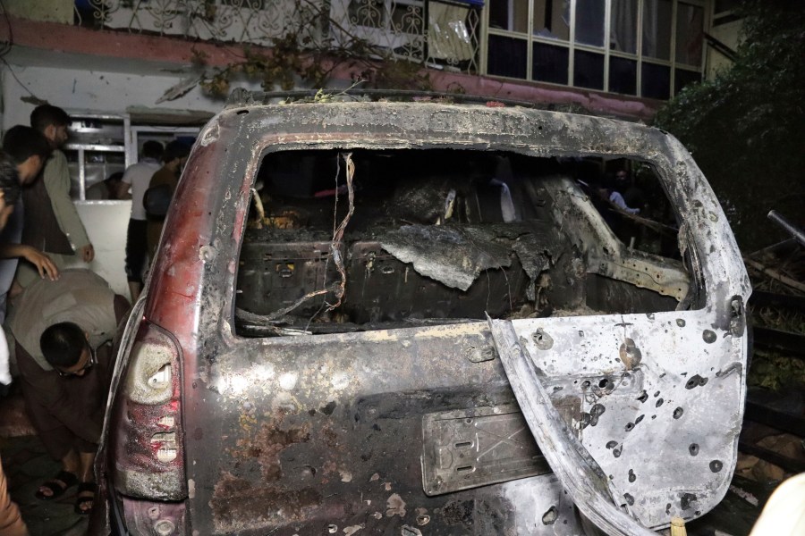 A destroyed vehicle is seen inside a house after a U.S. drone strike in Kabul, Afghanistan, Sunday, Aug. 29, 2021. A U.S. drone strike destroyed a vehicle carrying “multiple suicide bombers” from Afghanistan’s Islamic State affiliate on Sunday before they could attack the ongoing military evacuation at Kabul’s international airport, American officials said. (AP Photo/Khwaja Tawfiq Sediqi)