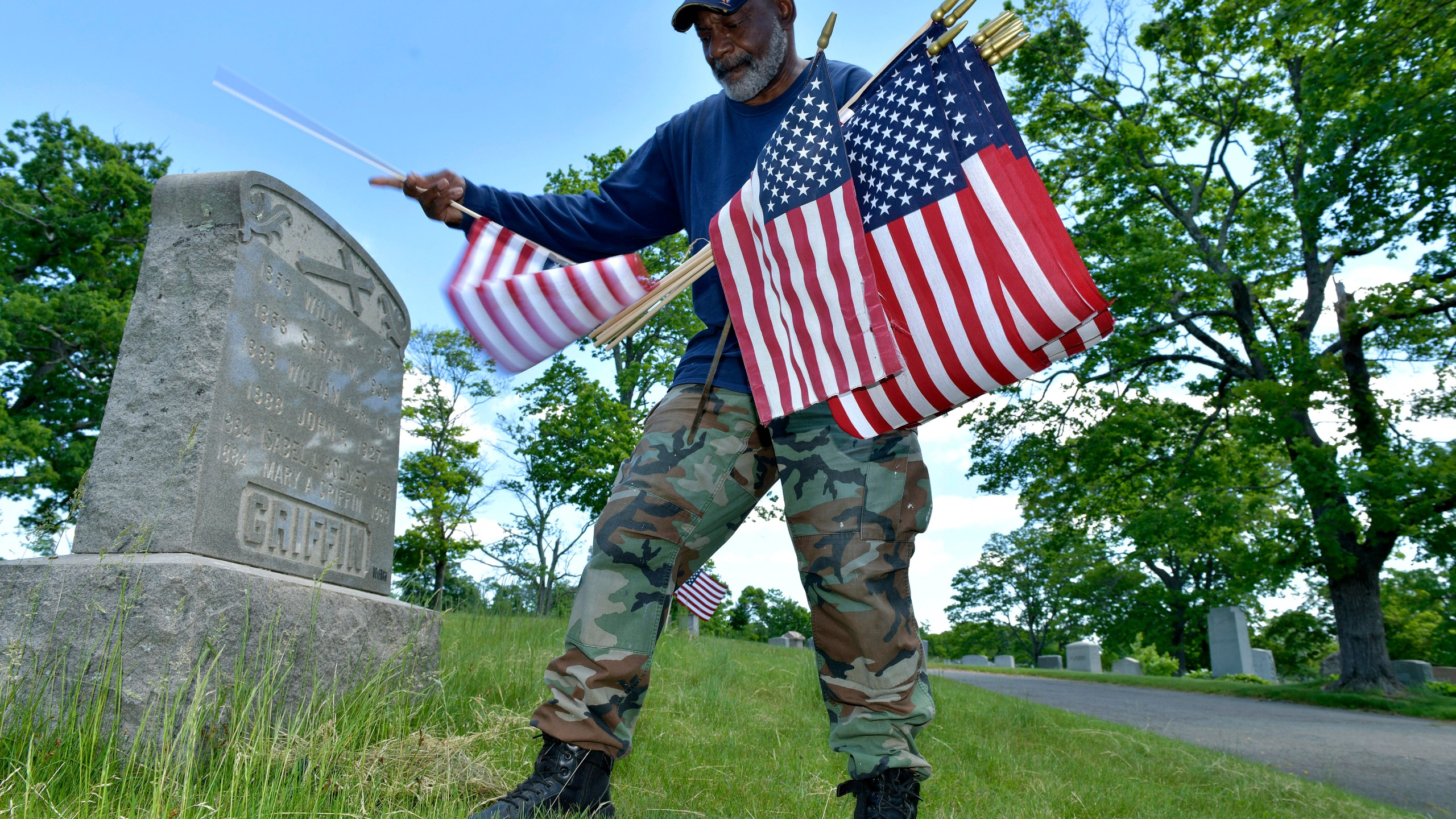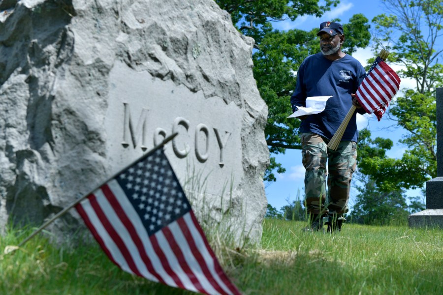 BOSTON (AP) — A pair of military vets navigate the hilly, meandering paths in a historic cemetery in Boston, searching out soldiers’ graves and planting American flags in front of them.