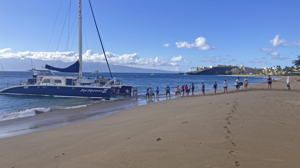 More than a dozen people formed an assembly line on Kaanapali Beach Saturday to unload water, toiletries, batteries and other essentials from a catamaran that sailed from another part of Maui.