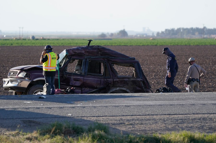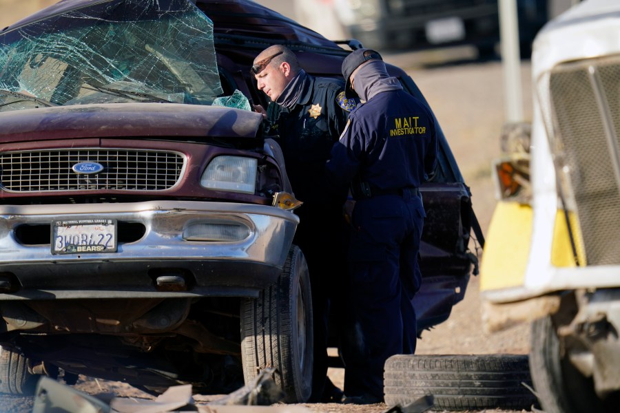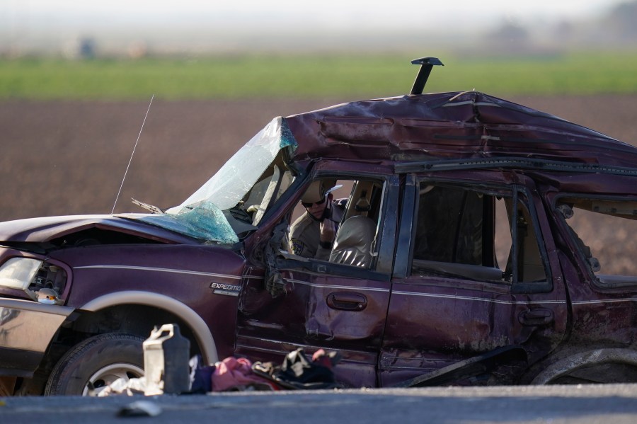 California Highway Patrol Officer Jake Sanchez said the SUV was a 1997 Ford Expedition that would typically seat eight to nine people legally. He said the SUV had stopped at an intersection and then drove “directly in the path of the big rig” just after 6 a.m. PST. The tractor-trailer full of gravel struck the left side of the SUV, which appeared to have been pushed off the road.