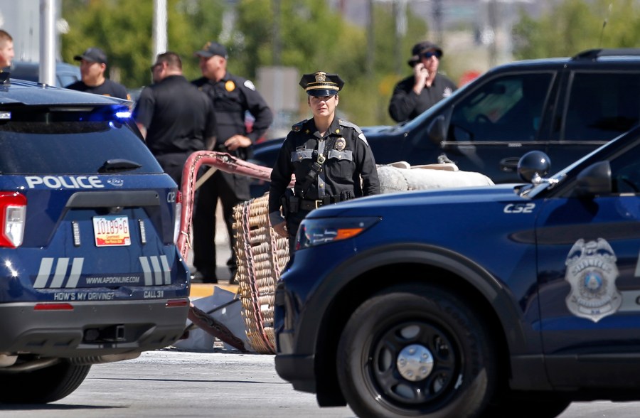 The intersection where the balloon crashed was still cordoned off late Saturday afternoon. The multi-colored balloon had skirted the top of the power lines, sending at least one dangling and temporarily knocking out power to more than 13,000 homes, said police spokesman Gilbert Gallegos.