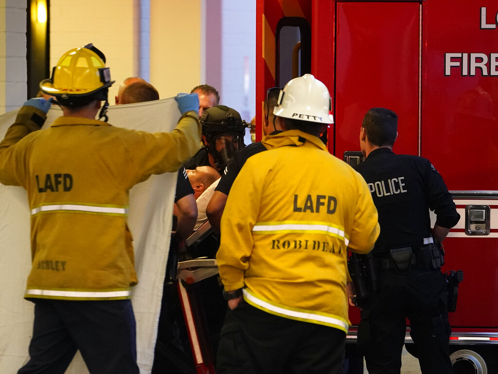 A suspect who stabbed multiple people and barricaded himself inside the Encino Hospital Medical Center is transported into a waiting ambulance after being extracted from the hospital in Encino, Calif., late Friday, June 3, 2022. (AP Photo/Damian Dovarganes)