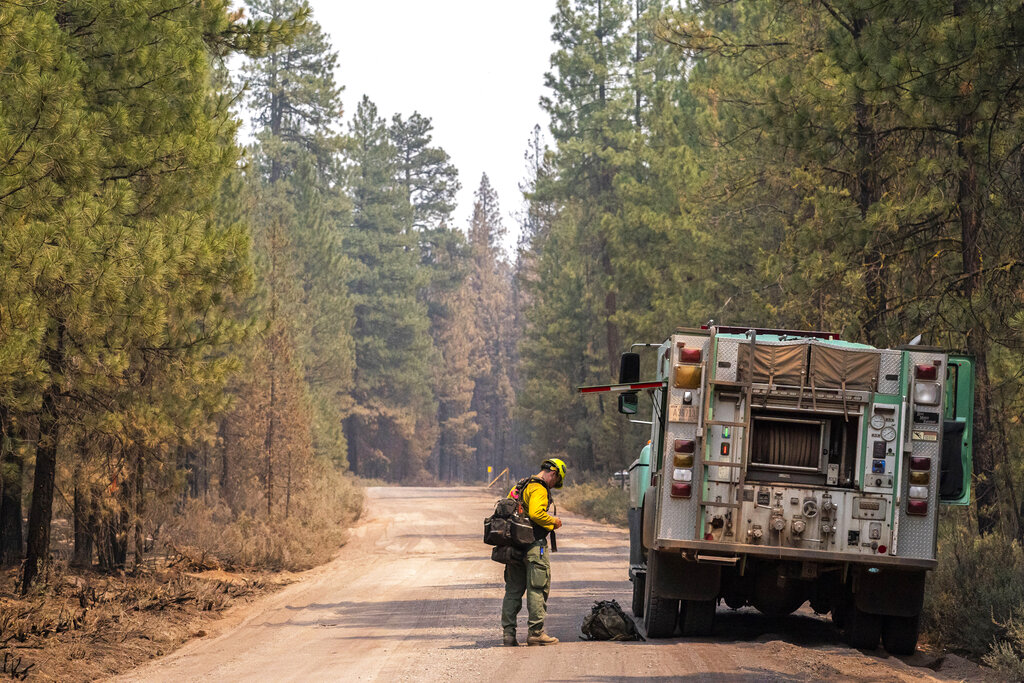 Tim McCarley was allowed to return briefly after the fire had passed over their rural community northwest of Bly. He found his home still standing and their cat inside unharmed. But the flames had crept within 5 feet of their house, the heat melting their trailer and storage units until they looked “like a melted beer can,” he told The Associated Press in a phone interview.