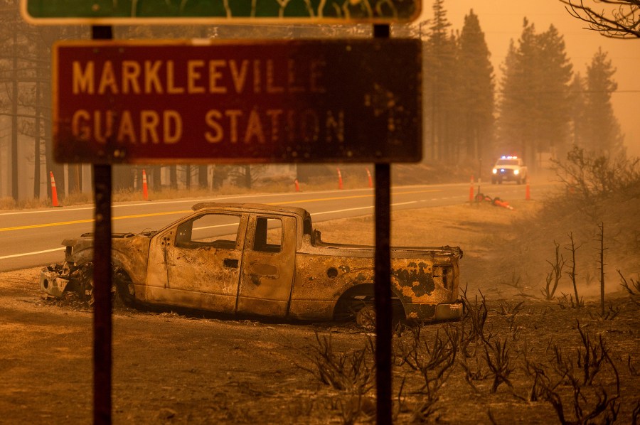 SAN FRANCISCO (AP) — A rapidly growing wildfire south of Lake Tahoe jumped a highway, prompting more evacuation orders and the cancellation of an extreme bike ride through the Sierra Nevada on Saturday as critically dangerous wildfire weather loomed in the coming days.