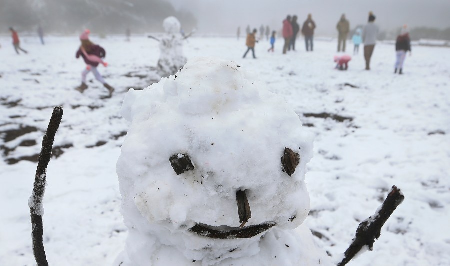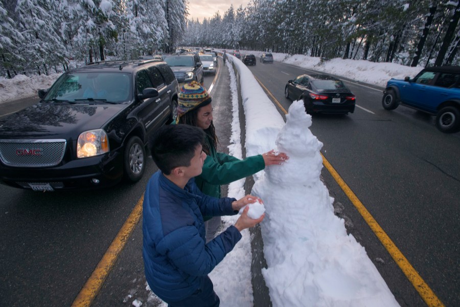 legs. Jonas Pao, left, and Phela Durosinmi, of Palo Alto, Calif., had time to build a snowman on the highway median while traffic was at a standstill along eastbound US 50 in Pollock Pines, Calif., Tuesday, Dec. 28, 2021. (AP Photo/Randall Benton)