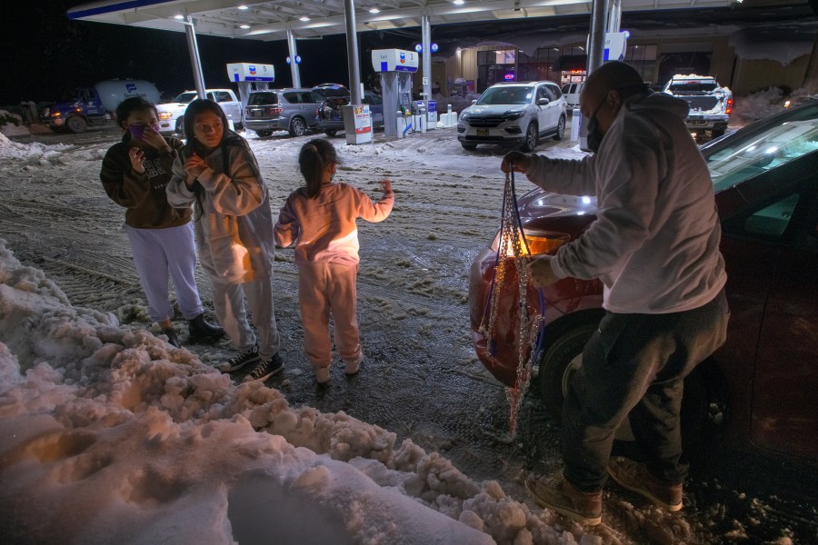 Jasmine DeGuzman 12, left, and her sisters Rachael 12, and Camille 7 shiver in the snow as their father Raymond DeGuzman of Hayward, Calif. removes snow chains from his tires in Camino, Calif., Tuesday, Dec. 28, 2021. The DeGuzmans turned back short of their destination as heavy snow caused eastbound traffic along US 50 to a crawl. (AP Photo/Randall Benton)