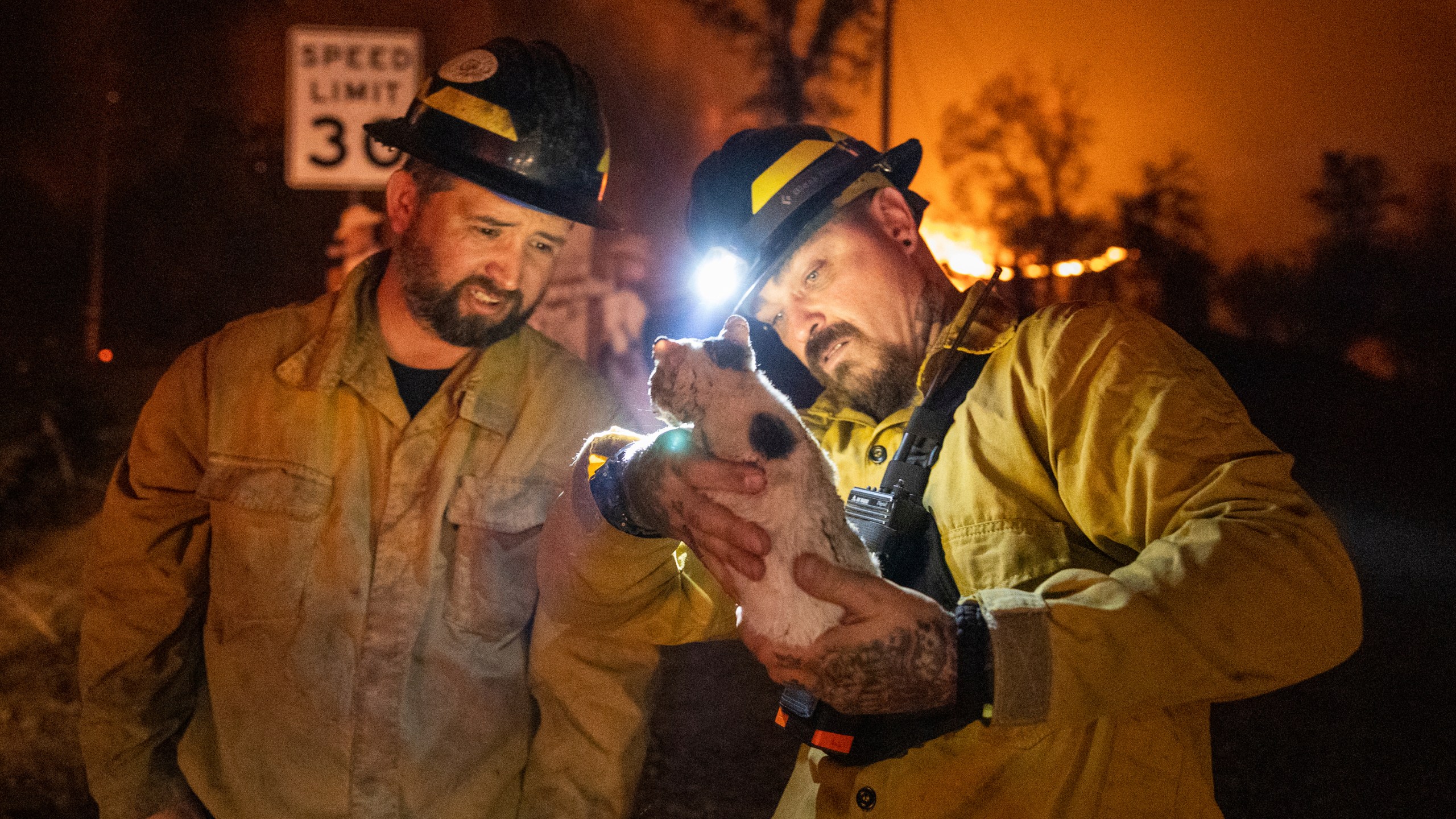 Private firefighter Bradcus Schrandt, right, holds an injured kitten while Joe Catterson assists, at the Zogg Fire near Ono, Calif., on Sunday, Sep. 27, 2020. (AP Photo/Ethan Swope)