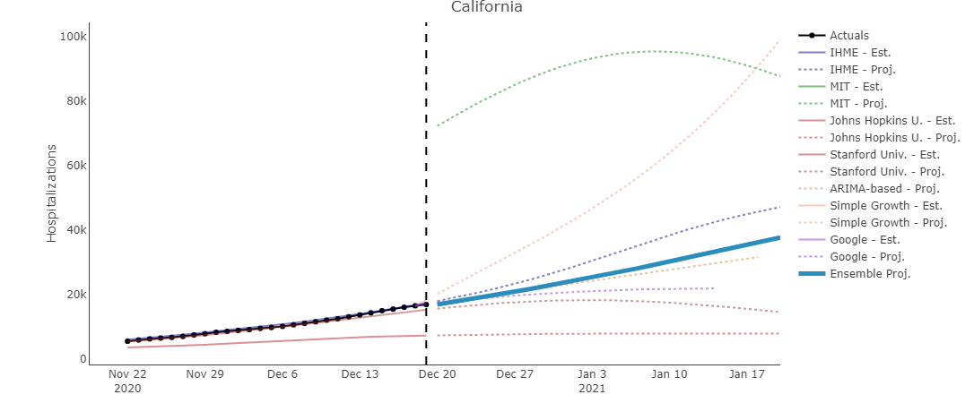 The black box (left) represents the current number of hospitalized COVID patients in California. The blue box represents the forecasted number of hospitalized patients at the 30 day mark based on models for California.