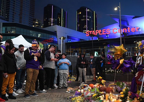 TOPSHOT – People gather around a makeshift memorial for former NBA and Los Angeles Lakers player Kobe Bryant after learning of his death, at LA Live plaza in front of Staples Center in Los Angeles on January 26, 2020. – Nine people were killed in the helicopter crash which claimed the life of NBA star Kobe Bryant and his 13 year old daughter, Los Angeles officials confirmed on Sunday. Los Angeles County Sheriff Alex Villanueva said eight passengers and the pilot of the aircraft died in the accident. The helicopter crashed in foggy weather in the Los Angeles suburb of Calabasas. Authorities said firefighters received a call shortly at 9:47 am about the crash, which caused a brush fire on a hillside. (Photo by Apu GOMES / AFP) (Photo by APU GOMES/AFP via Getty Images)