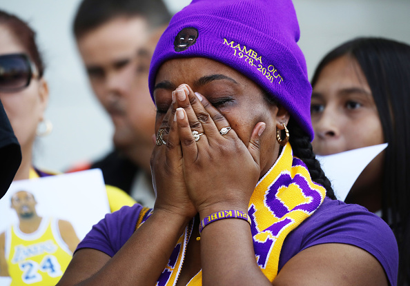 LOS ANGELES, CALIFORNIA – FEBRUARY 24: A fan becomes emotional while watching a live broadcast of the ‘Celebration of Life for Kobe and Gianna Bryant’ memorial service on a fan’s iPad outside the Staples Center on February 24, 2020 in Los Angeles, California. Some fans were disappointed that the Staples Center didn’t broadcast the event on television screens outside for those who didn’t have tickets. Los Angeles Lakers NBA star Kobe Bryant, 41, and his 13-year-old daughter Gianna were killed along with seven others in a helicopter crash near Los Angeles on January 26. (Photo by Mario Tama/Getty Images)
