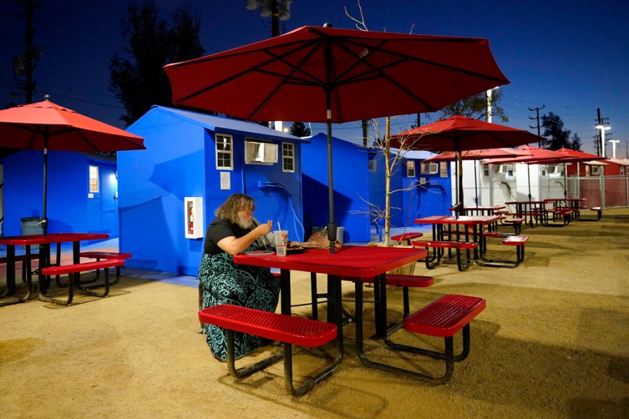LOS ANGELES (AP) — Amy Skinner took notice when brightly colored structures started taking shape earlier this year on a drab patch of asphalt across from a Los Angeles park where she occasionally slept outdoors.