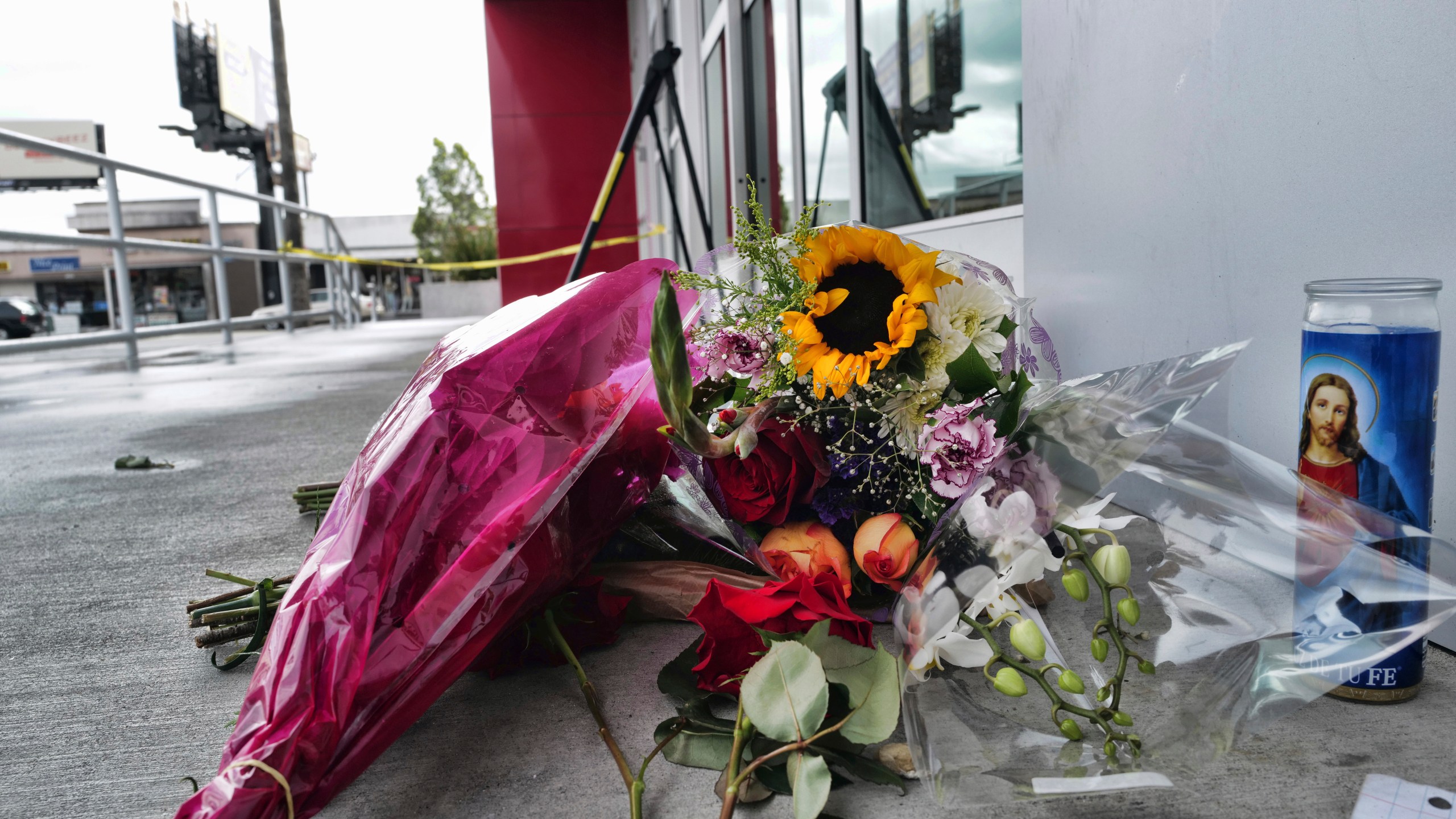 Mourners left flowers and a votive candle outside the store on Christmas in a memorial for Orellana-Peralta.