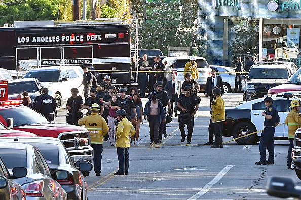 TOPSHOT – Police officers escort people after a suspect barricaded inside a Trader Joe’s supermarket in Silverlake, Los Angeles, on July 21, 2018. – A suspect wanted in connection with a shooting was barricaded inside a supermarket in the US city of Los Angeles on Saturday, police said, in what US media reported was a possible hostage situation. (Photo by Robyn Beck / AFP) (Photo credit should read ROBYN BECK/AFP via Getty Images)