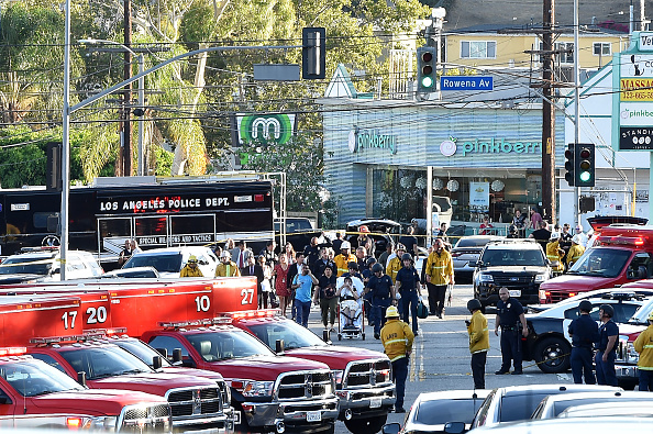 TOPSHOT – Police officers and members of the Los Angeles Fire Department escort a woman on a stretcher after a suspect barricaded inside a Trader Joe’s supermarket in Silverlake, Los Angeles, on July 21, 2018. – A suspect wanted in connection with a shooting was barricaded inside a supermarket in the US city of Los Angeles on Saturday, police said, in what US media reported was a possible hostage situation. (Photo by Robyn Beck / AFP) (Photo credit should read ROBYN BECK/AFP via Getty Images)
