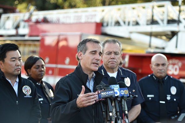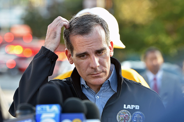Los Angeles Mayor, Eric Garcetti, looks on before addressing the press after a suspect barricaded inside a Trader Joe’s supermarket in Silverlake, Los Angeles, on July 21, 2018. – A suspect wanted in connection with a shooting was barricaded inside a supermarket in the US city of Los Angeles on Saturday, police said, in what US media reported was a possible hostage situation. (Photo by Robyn Beck / AFP) (Photo credit should read ROBYN BECK/AFP via Getty Images)