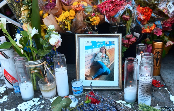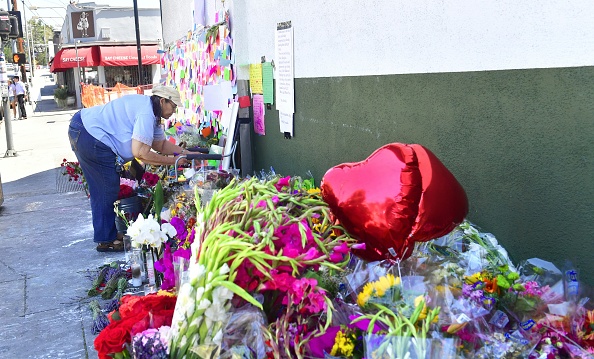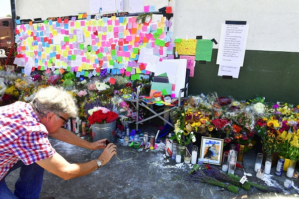 Claire Houston leaves flowers at a memorial for Melyda Corado, the assistant manager at the Silver Lake Trader Joe’s, who was killed in a July 21 shootout between police and a gunman in Los Angeles, California on July 23, 2018. – The gunman, Gene Evin Atkins, took hostages inside a supermarket in Los Angeles on Saturday after a gun battle with police, leaving a store employee dead before the suspect handcuffed himself and surrendered. The Los Angeles Police Department revealed on July 24 that Corado died as a result of police gunfire. (Photo by Frederic J. BROWN / AFP) (Photo credit should read FREDERIC J. BROWN/AFP via Getty Images)