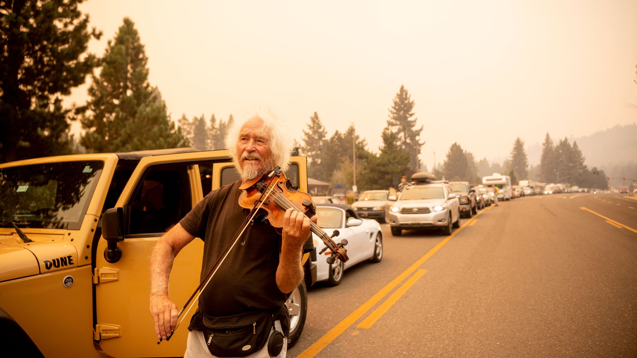 SOUTH LAKE TAHOE, Calif. (NEXSTAR) — Evacuees of the raging Caldor Fire found themselves stuck in deadlocked traffic Monday with nothing to do but wait and worry. A few folks found themselves with an added source of entertainment (and distraction): Mel Smothers on the violin.