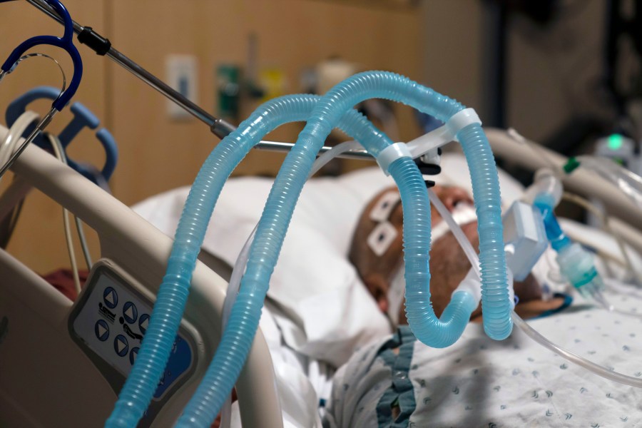 Ventilator tubes are attached a COVID-19 patient at Providence Holy Cross Medical Center in the Mission Hills section of Los Angeles, Thursday, Nov. 19, 2020. California is imposing an overnight curfew on most residents as the most populous state tries to head off a surge in coronavirus cases that it fears could tax its health care system, Gov. Gavin Newsom announced Thursday. (AP Photo/Jae C. Hong)
