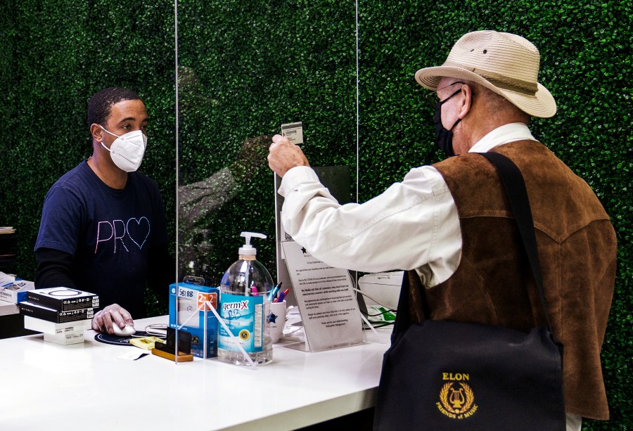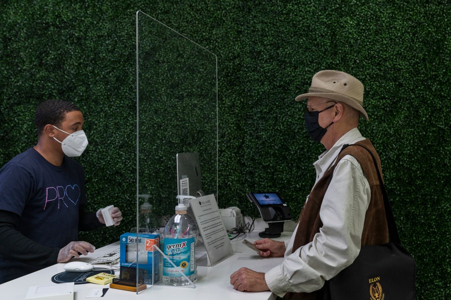 Melrose Mac Service coordinator, Josh Smart, left, helps out customer Eric Hall, Monster Lighting general manager, to make a contact-less purchase through a plexiglass wall at the store in Burbank, Calif., Friday, Nov. 27, 2020. Los Angeles County has announced a new stay-home order as coronavirus cases surge out of control in the nation’s most populous county. The three-3 week order take effect Monday, Nov. 30, 2020. The order advises residents to stay home “as much as possible” and to wear a face covering when they go out. (AP Photo/Damian Dovarganes)