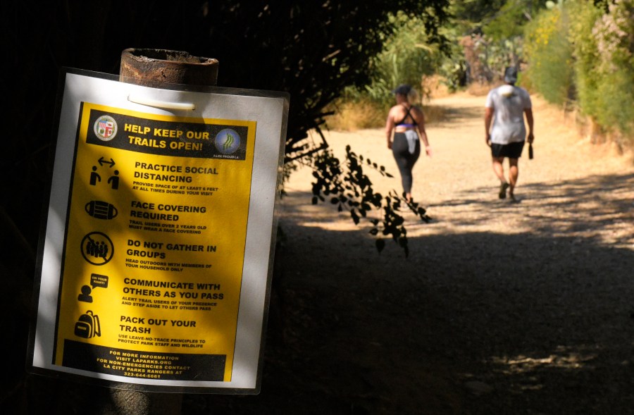 FILE – In this May 28, 2020, file photo, hikers utilize the Innsdale Trail near the famed Hollywood Sign in Los Angeles. The “safer at home” public health order announced Friday, Nov. 27 in Los Angeles County calls for 10 million residents to stay home “as much as possible” and bars them from gathering with people outside of their household for public or private occasions. Schools that currently are holding in-person classes also mainly will be allowed to remain open, as will beaches, parks and trails.(AP Photo/Mark J. Terrill, File)