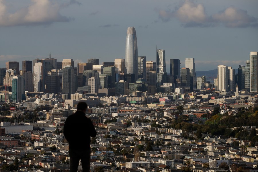 FILE – In this March 16, 2020, file photo, a person looks toward the skyline from Bernal Heights Hill in San Francisco. The San Francisco 49ers and other teams may need to find a temporary new home after Santa Clara County on Saturday, Nov. 28, 2020 banned all contact sports from holding games and practices for the next three weeks. County officials issued the directives in response to rising cases of the coronavirus in the area. (AP Photo/Jeff Chiu, File)